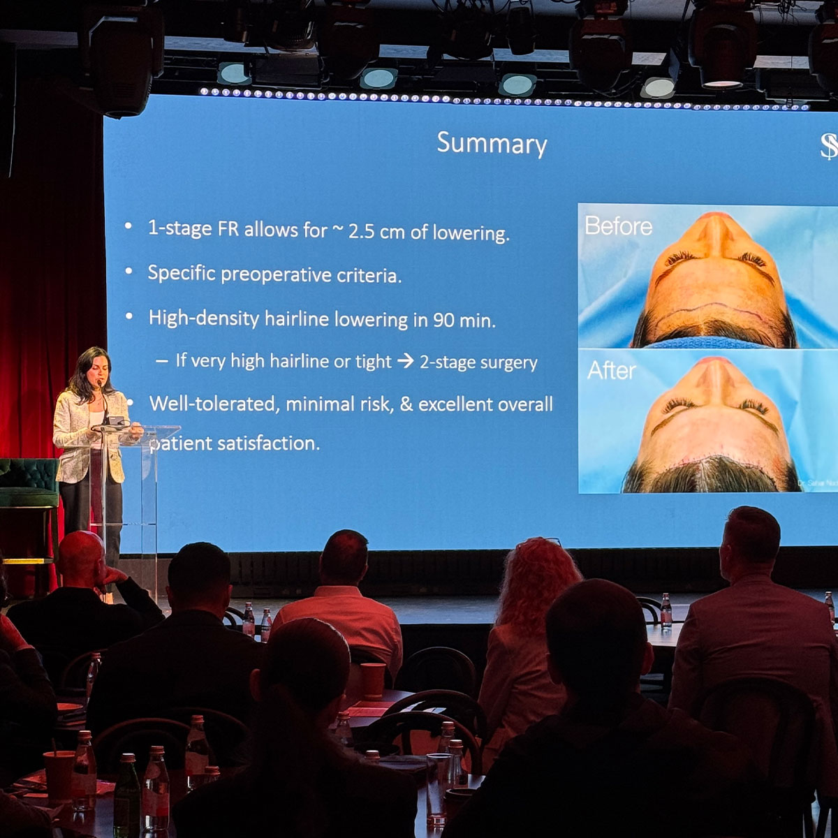 Dr. Sahar Nadimi lecturing at the NYC Facelift and Rhinoplasty Master Course in April 2025 on “Novel Techniques in Hairline Lowering and Forehead Reduction Surgery.”